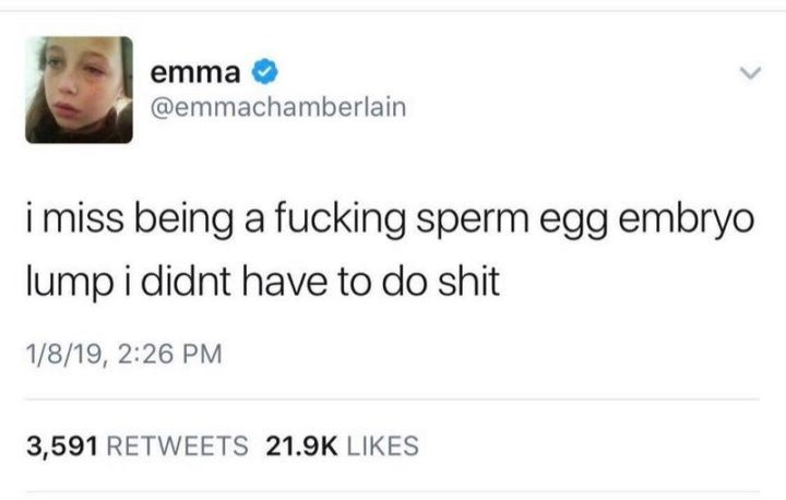 “I miss being a [censored] sperm-egg embryo lump I didn’t have to do $#!t.”