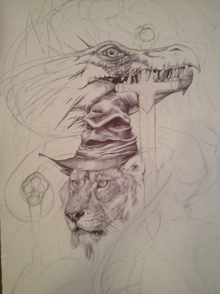 On day 3, she completed the sorting hat and began drawing in the dragon.