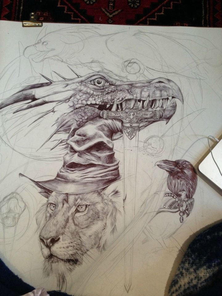 On day 5, she begins working on the dragon’s body and minor touches to the raven.