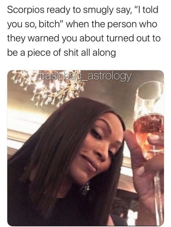 !["Scorpios ready to smugly say, "I told you so, [censored]" when the person who they warned you about turned out to be a piece of [censored] all along."](https://www.winkgo.com/wp-content/uploads/2022/01/scorpio-zodiac-memes-38-720x959.jpg)