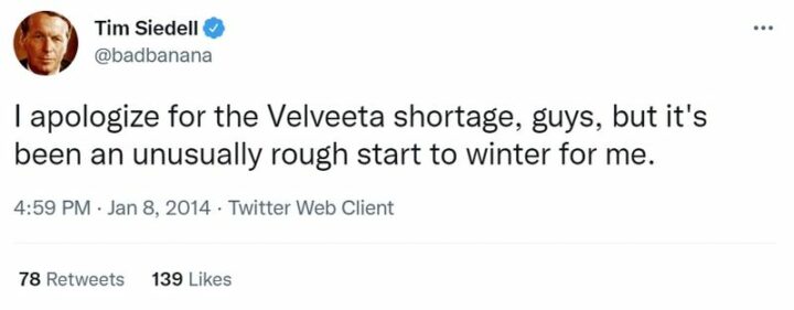 1) “I apologize for the Velveeta shortage, guys, but it’s been an unusually rough start to winter for me.”
