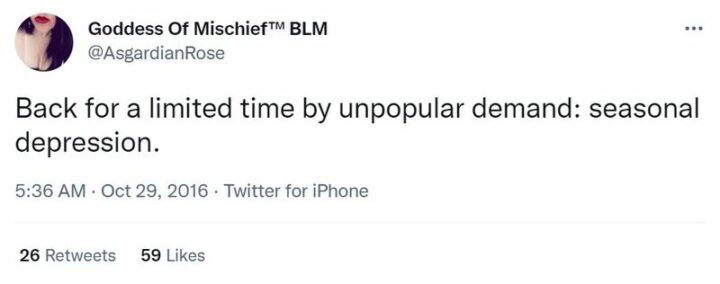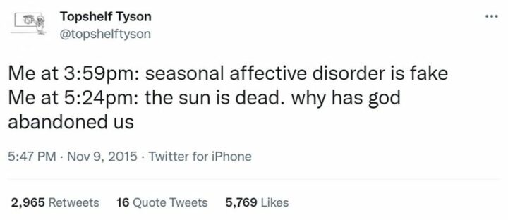 18) “Me at 3:59 pm: Seasonal affective disorder is fake. Me at 5:24 pm: The sun is dead. Why has God abandoned us.”