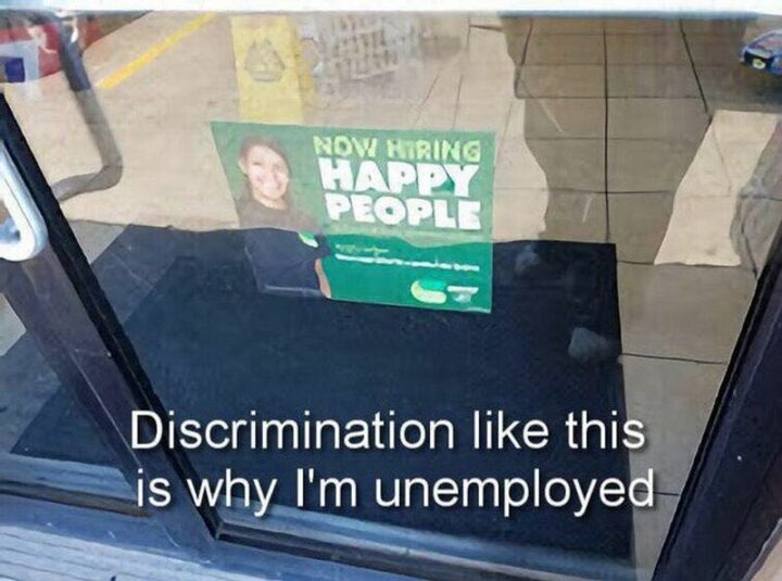 10) “Discrimination like this is why I’m unemployed: Now hiring happy people.”
