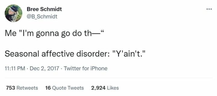 12) “Me: I’m gonna go do th-. Seasonal affective disorder: Y’ain’t.”