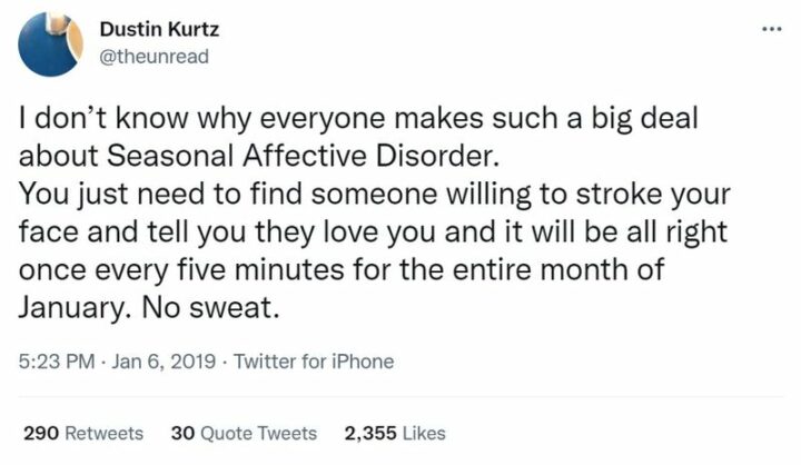14) “I don’t know why everyone makes such a big deal about seasonal affective disorder. You just need to find someone willing to stroke your face and tell you they love you and it will be alright once every five minutes for the entire month of January. No sweat.”