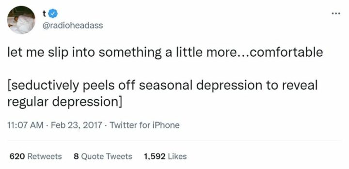 17) “Let me slip into something a little more…Comfortable [seductively peels off seasonal depression to reveal regular depression].”
