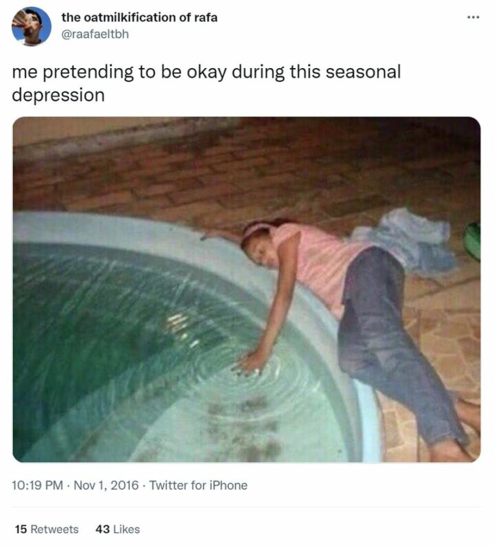 19) “Me pretending to be okay during this seasonal depression.”