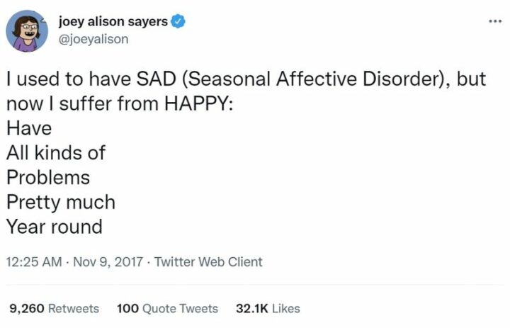 27) “I used to have SAD (Seasonal Affective Disorder), but now I suffer from HAPPY: Have All kinds of Problems Pretty much Year-round.”