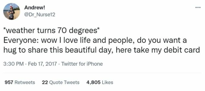 28) “*weather turns 70 degrees* Everyone: Wow I love life and people, do you want a hug to share this beautiful day, here take my debit card.”