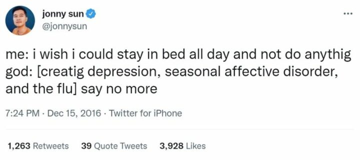 32) “Yeah, seasonal depression is cool but have u ever been depressed for 12 years straight.”