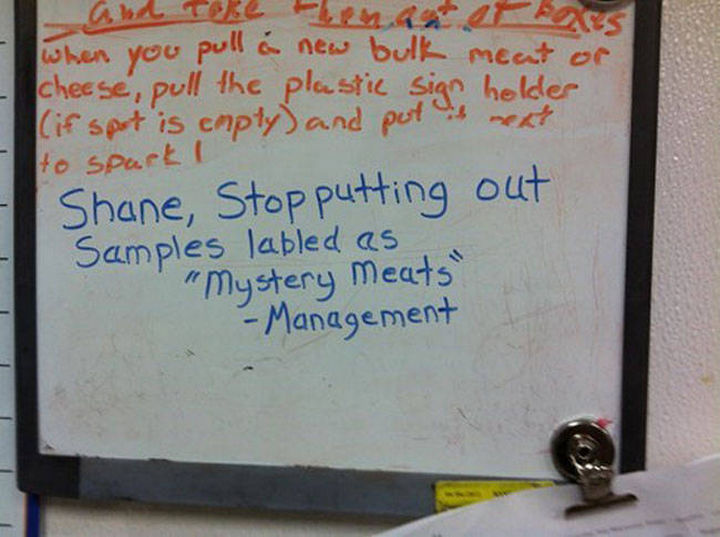 “Shane, stop putting out samples labeled as “mystery meats” – Management.”