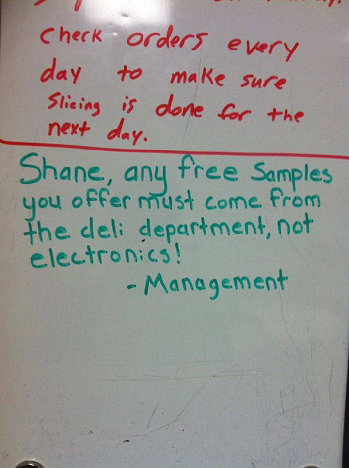 “Shane, any free samples you offer must come from the deli department, not electronics! – Management.”