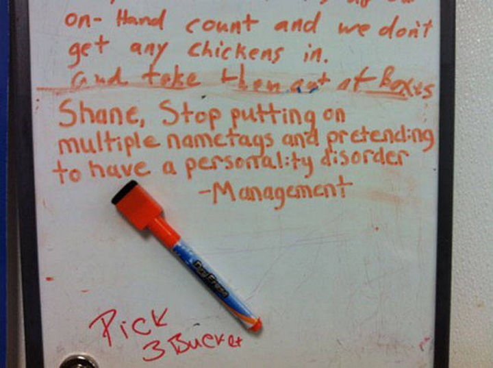 “Shane, stop putting on multiple nametags and pretending to have a personality disorder – Management.”