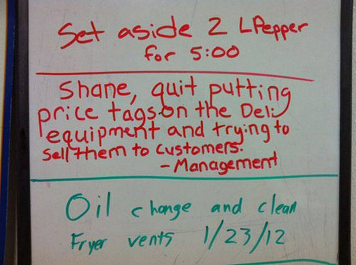 “Shane, quit putting price tags on the deli equipment and trying to sell them to customers – Management.”