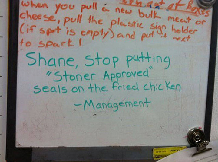 “Shane, stop putting “Stoner Approved” seals on the fried chicken – Management.”