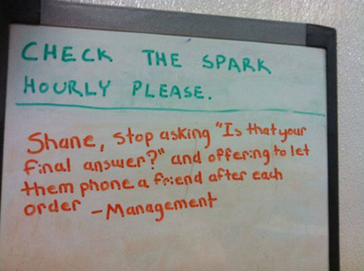 “Shane, stop asking “Is that your final answer?” and offering to let them phone a friend after each order – Management.”