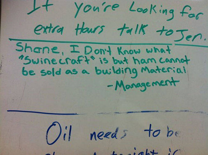 “Shane, I don’t know what “Swinecraft” is but ham cannot be sold as a building material – Management.”