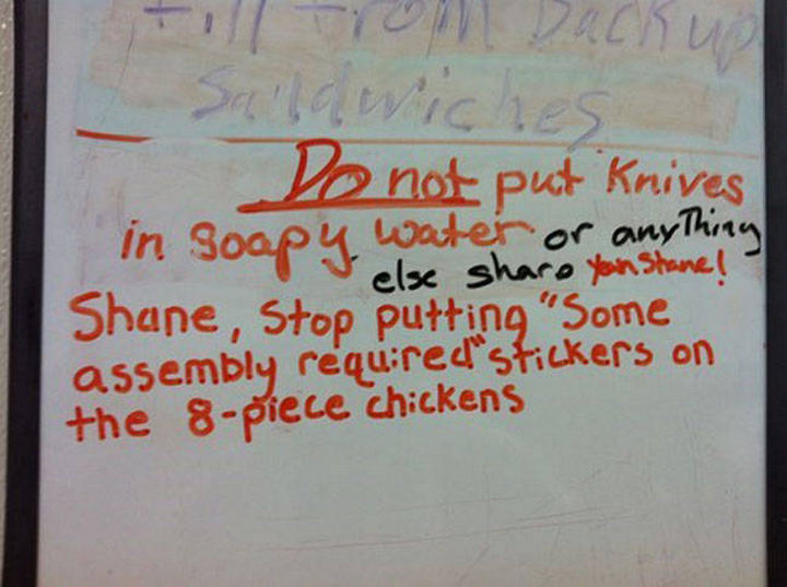 “Shane, stop putting “Some assembly required” stickers on the 8 piece chickens – Management.”