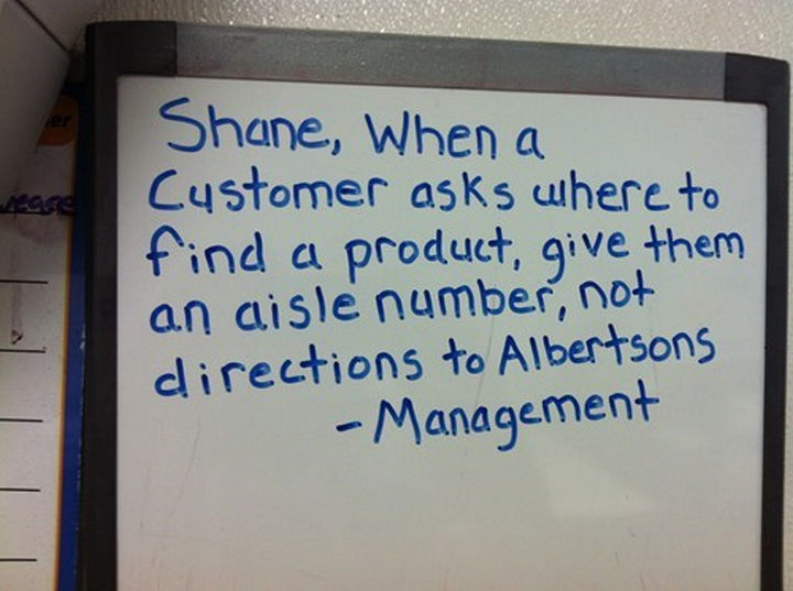 “Shane, when a customer asks where to find a product, give them an aisle number, not directions to Albertsons – Management.”