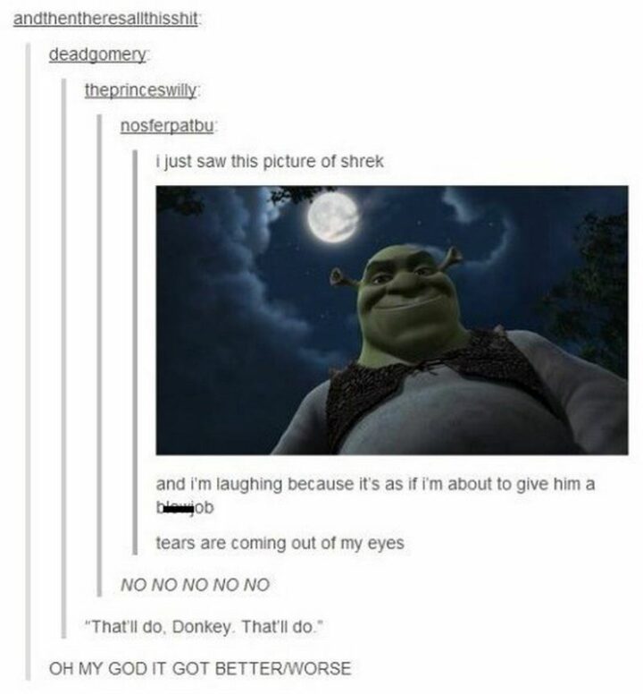 !["I just saw this picture of Shrek and I'm laughing because it's as if I'm about to give him a [censored]. Tears are coming out of my eyes. No. That'll do, donkey. That'll do. Oh my God, it got better/worse."](https://www.winkgo.com/wp-content/uploads/2022/07/shrek-memes-15-720x776.jpg)