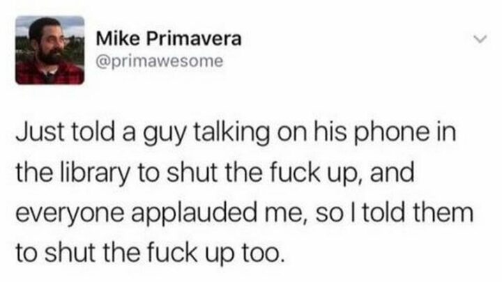 “Just told a guy talking on his phone in the library to shut the [censored] up, and everyone applauded me, so I told them to shut the [censored] up too.”