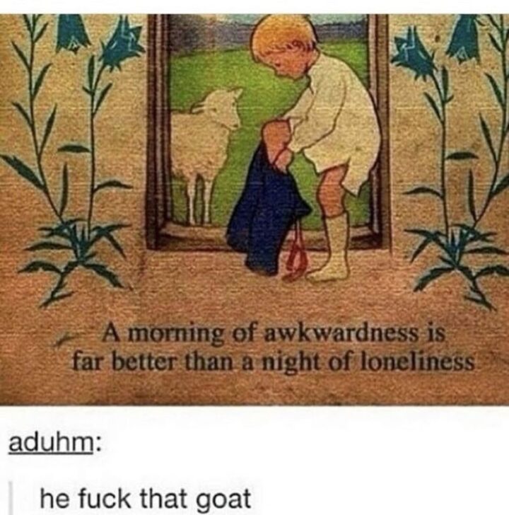 !["A morning of awkwardness is far better than a night of loneliness. He [censored] that goat."](https://www.winkgo.com/wp-content/uploads/2021/08/stupid-memes-37-720x728.jpg)