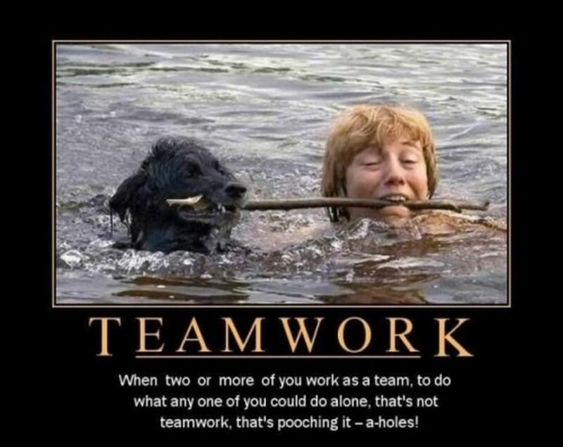 !["Teamwork: When two or more of you work as a team to do what any one of you could do alone. That's not teamwork, that's pooching it [censored]!"](https://www.winkgo.com/wp-content/uploads/2023/06/teamwork-memes-47-800x635.jpg)