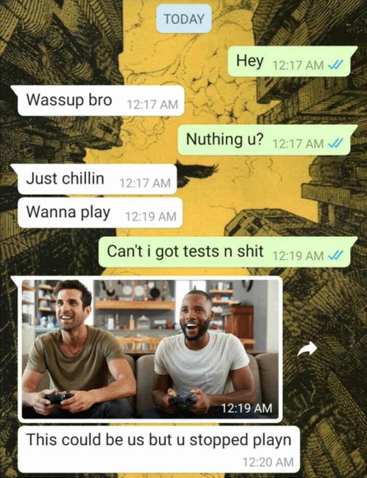 “Hey. Wassup bro. Nothing u? Just chillin’. Wanna play?” Can’t, I got tests n [censored]. This could be us but u stopped playin’.”