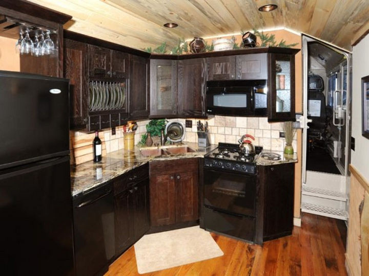 The kitchen is modern and rivals a kitchen you’d find in many homes or condos.