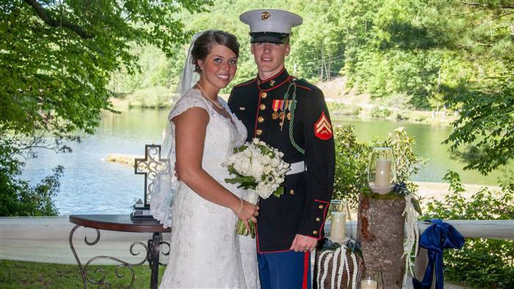 U.S. Marine Corps Cpl. Caleb Earwood and his now-wife Maggie Earwood held hands in prayer and kept their eyes closed to not see each other before the wedding.