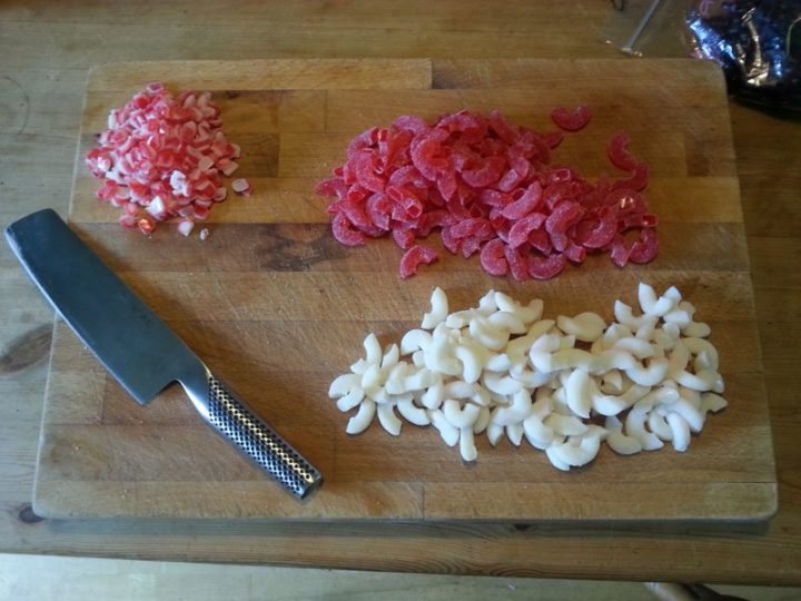 You’ll have a small number of leftover pieces (see the top left corner of cutting board) so eat these later 🙂
