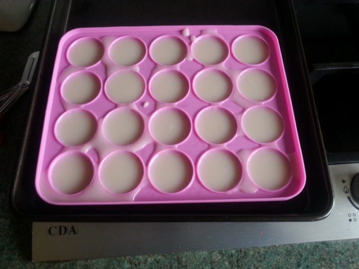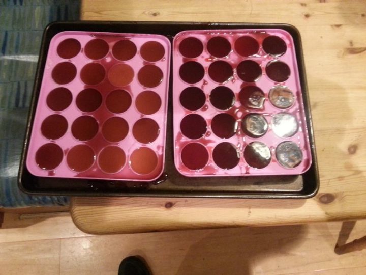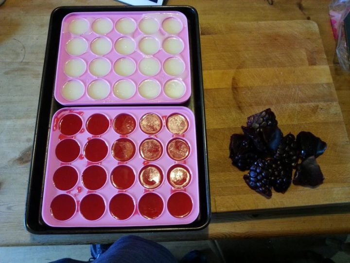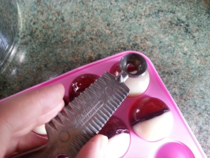 Pour melted mixture into molds. Don’t fill to the top, leave 1-2 millimeters for purple gelatin.