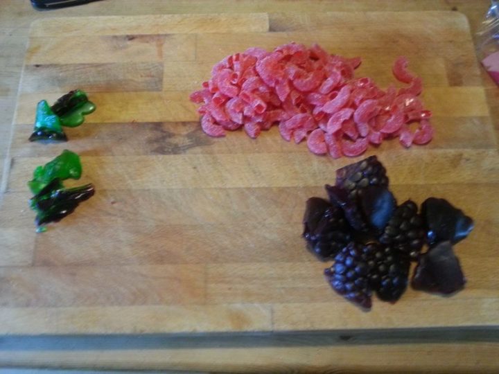 For the purple color, gummy grapes were used; therefore, just remove the green parts and discard.