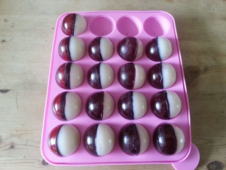 Pour a small layer of melted purple gelatin over both red and white halves.