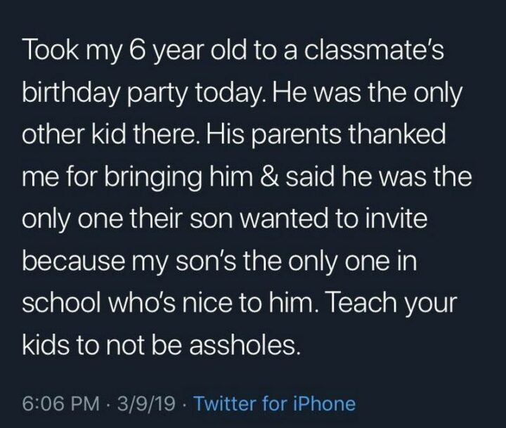 “Took my 6-year-old to a classmate’s birthday party today. He was the only other kid there. His parents thanked me for bringing him and said he was the only one their son wanted to invite because my son’s the only one in school who’s nice to him. Teach your kids to not be [censored].”