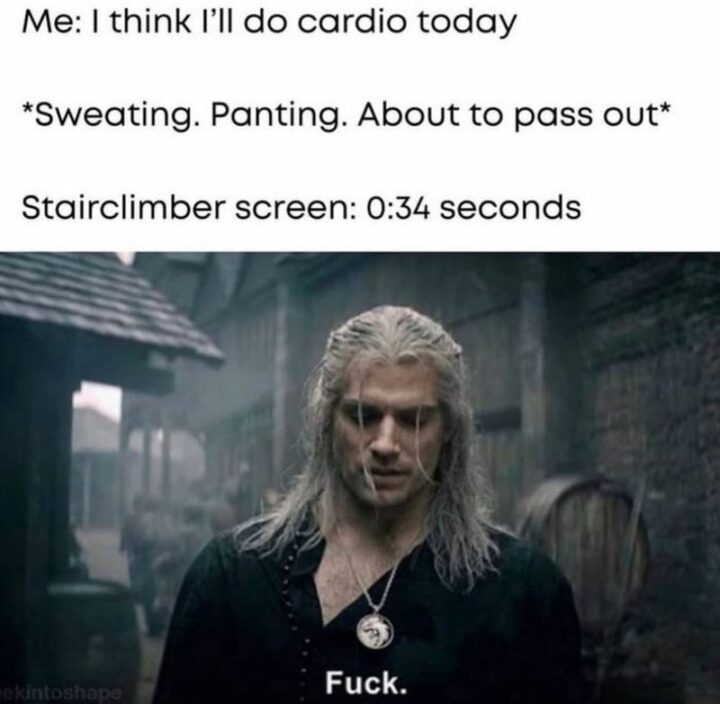 “Me: I think I’ll do cardio today. *Sweating. Panting. About to pass out* Stairclimber screen: 0:34 seconds. [censored].”